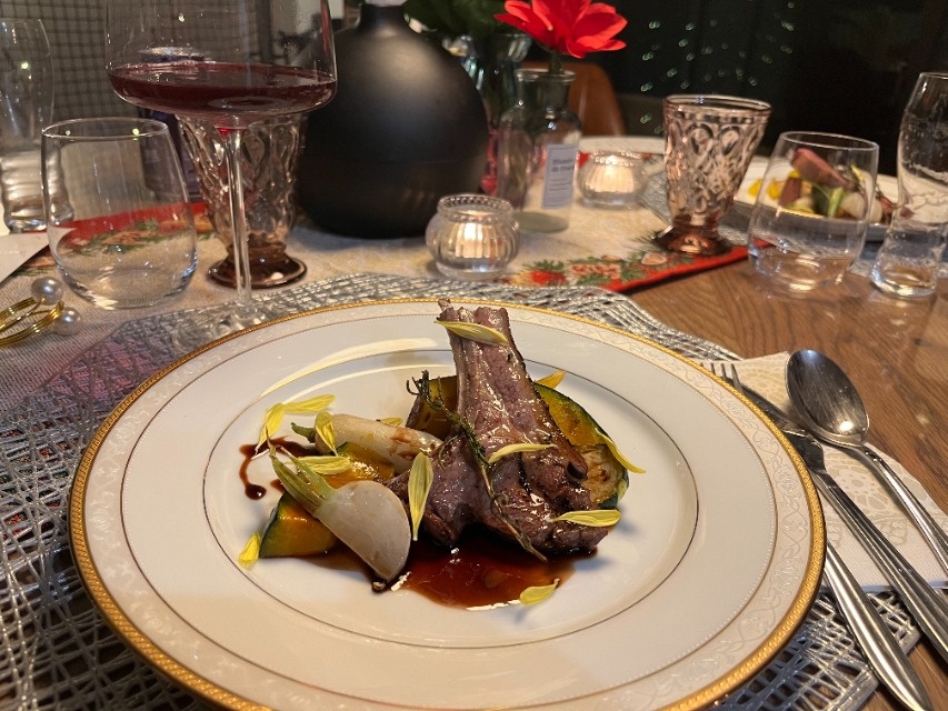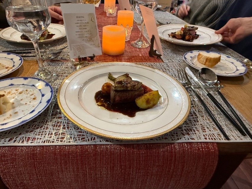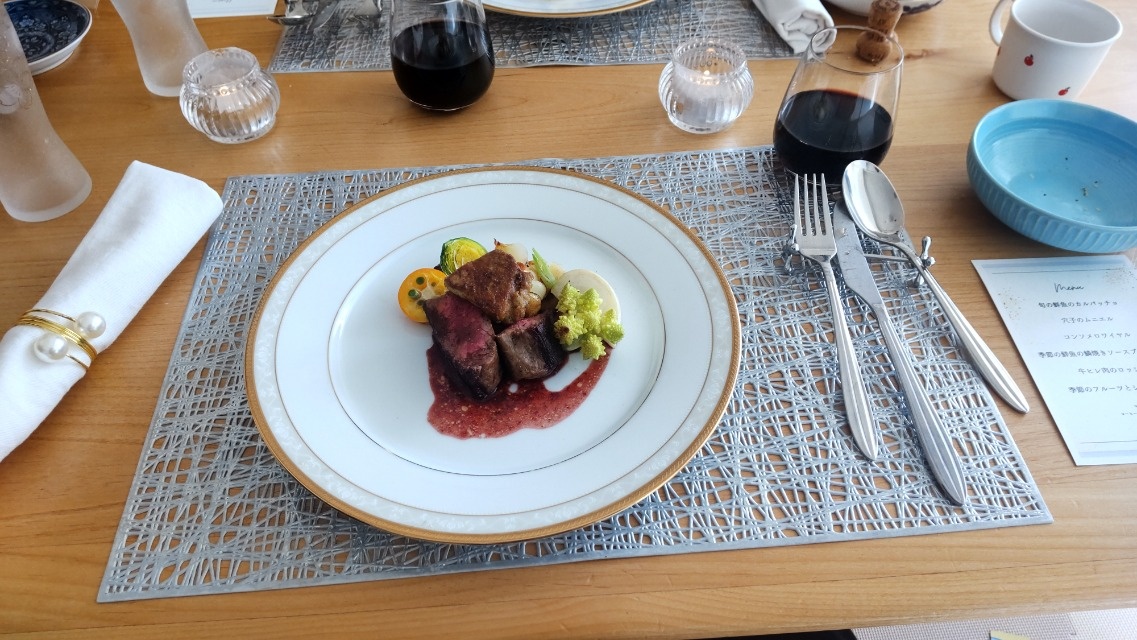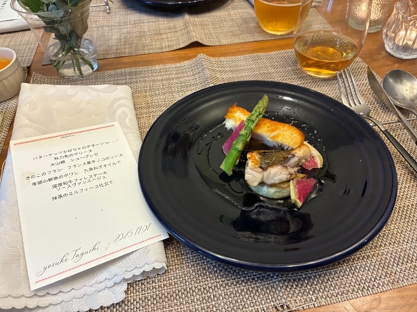 海鮮フルコース〜に和牛ステーキを加えていただきました。 味も盛り付けも見事で、自宅の食器も高価に見えると主人も感動していました。 田口シェフの人柄も良く、優しくシンプルに料理の説明等してくださり、娘夫婦と孫の5人の食事の時間をゆっくりと過ごさせていただきました。 テーブルコーディネート、キャンドル、お花、バケット、コーヒーも用意していただき想像以上に素敵な食卓となりました。 大満足です。 又、機会がありましたら、お願いしたいと思います。 ありがとうございました。
