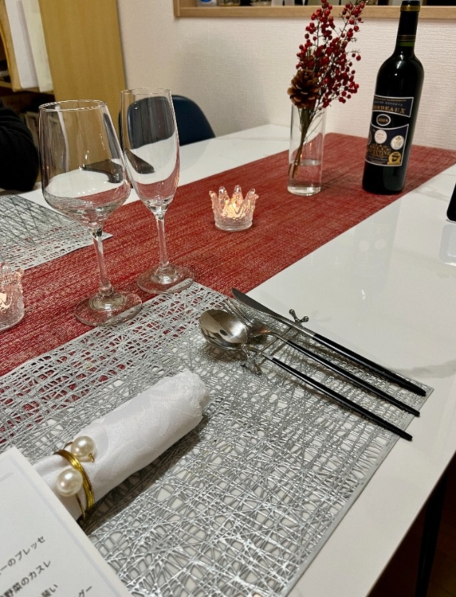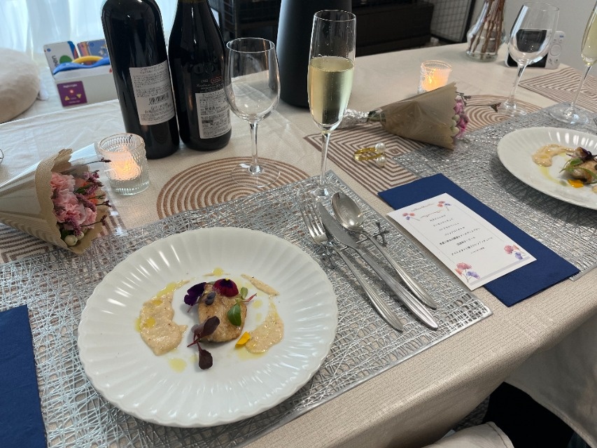父の退職祝いでお願いさせていただきました。 テーブルセッティングからこだわっていただき、キャンドルやお花などを飾っていただいたことで、自宅ながら贅沢な雰囲気で楽しむことができました。 お料理もどれも絶品で、見た目も美しくて感動の連続でした。 最後のデザートは父のプレートにメッセージを書いていただき、最後まで楽しく食事をすることができました! デザートの際に出していただいたコーヒーが美味しく、シェフは『特にこだわりはなく、、、』とのことでしたが、やはりあのコーヒーが気になります。笑 素敵な食事をありがとうございました。