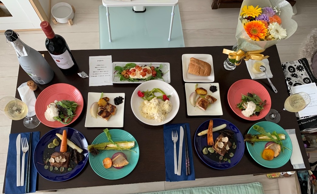 結婚記念日で利用させていただきました。 小さな子どもがいるので外食でコース料理は躊躇する部分がありましたが、子どもの様子を見ながらゆっくり過ごすことができました。 お料理はどれもとても美味しく、夫婦で「こんなお料理が自宅で食べられるなんて!」と感想してしまいました。 味付けやお料理をお出しいただくタイミングも、都度声かけをしていただき、大変ありがたかったです。 また1歳8か月児の子どもにもキッズプレートをお願いしましたが、リクエスト通りの薄味を配慮していただき、でも素材のお味でとても美味しく息子もパクパク満面の笑みで食べておりました。 お腹も気持ちも大満足でした。 お花のプレゼントもありがとうございました。 またこのような機会にはぜひ田口フェフにお願いさせていただきたいと思います!